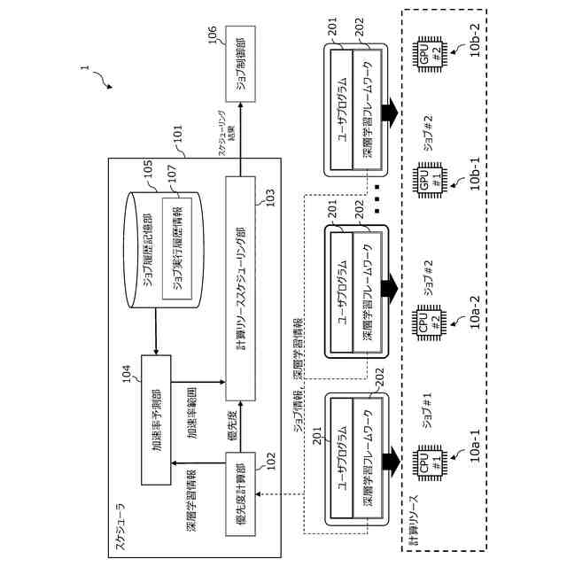 【解決手段】深層学習モデルについての処理対象のジョブに関する情報に基づき、深層学習モデルの種類とバッチサイズと加速率とを対応付けたプログラムの実行履歴107を参照して、深層学習モデルの実行に伴う加速率の予測を行ない、この加速率の予測結果に基づいて、計算リソース10bに割り付けるプログラムの順序の決定をする。