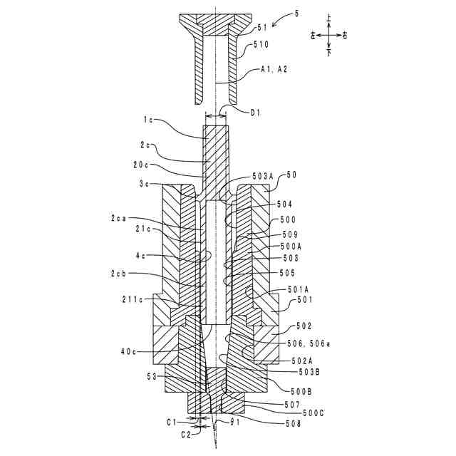 前記成形孔は、フランジ部ガイド部と、前記フランジ部ガイド部の前記前側に配置され前記フランジ部ガイド部よりも内径が小径の軸部ガイド部と、前記軸部ガイド部の前記前側に配置され前記後側から前記前側に向かって内径が縮径する口絞り部と、を有し、