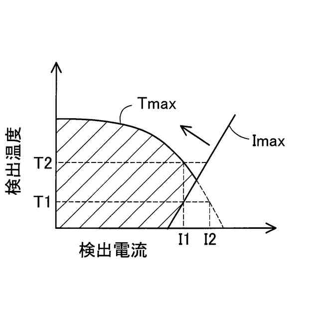 前記検出電流と、前記上限温度として前記第1上限温度よりも高い第2上限温度とがマップまたは式で関連付けられた第2関係と、