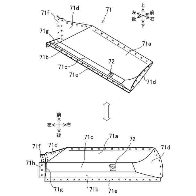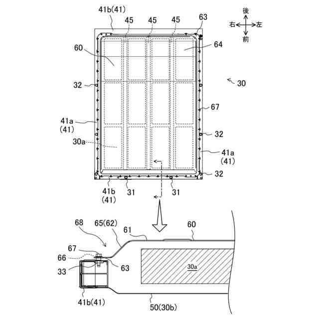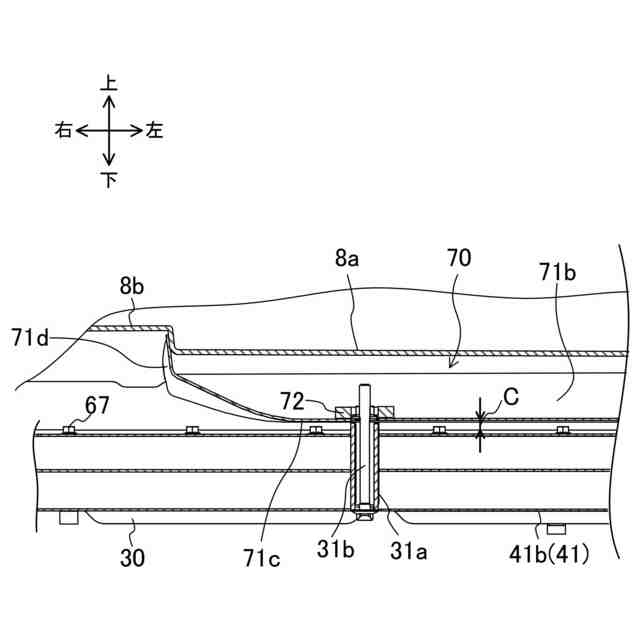 各アウトリガー26の車幅方向の内側には、後方に向かうほど車幅方向を外側に傾斜した傾斜面58が設けられている。バッテリケース52の左右の前隅部分には傾斜面56が設けられている。これら傾斜面56と各アウトリガー26の傾斜面58とが、クリアランスを介して対向するように配置されている。