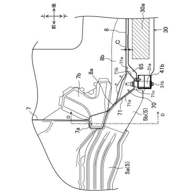 そのため、バッテリユニットを前方に大きくすると、トルクボックスと干渉する。従って、この場合も、特許文献1の車体構造と同様に、トルクボックスを避けてバッテリユニットを配設せざるを得ない。バッテリユニットの容量が減る。