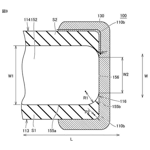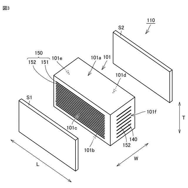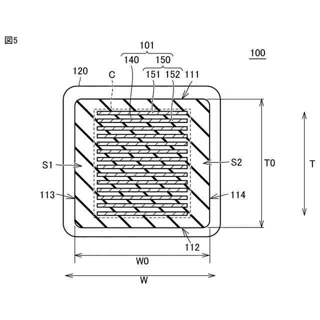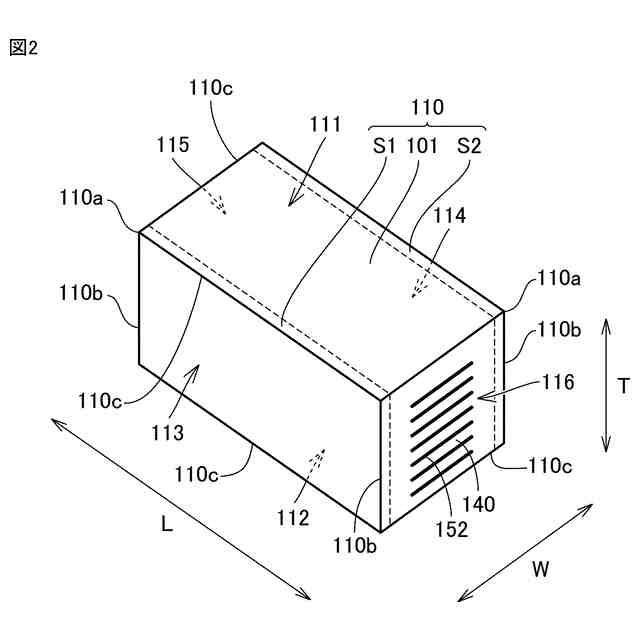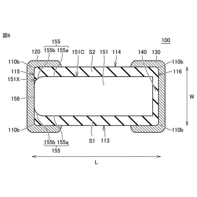 【解決手段】積層セラミックコンデンサ100において、外部電極120、130は、第1端面115及び第2端面116各々に設けられ、複数の内部電極層151他と接続されている。長さ方向Lにおける素体部の中央部における、積層方向及び幅方向Wに沿う断面において、複数の内部電極層における幅方向Wの最大ずれ量は、5μm以下である。複数の内部電極層の各々の幅方向Wの両縁部155は、2本の直線部155aと、2本の曲線部155bとからなる。2本の直線部は、幅方向Wに互いに間隔をあけて長さ方向Lに直線状に延びている。2本の曲線部155bは、2本の直線部155aにそれぞれ接続されている。2本の曲線部155bは、長さ方向Lにおいて2本の直線部155aから離れるにしたがって幅方向Wにおいて互いに接近するように一定の曲率にて湾曲している。