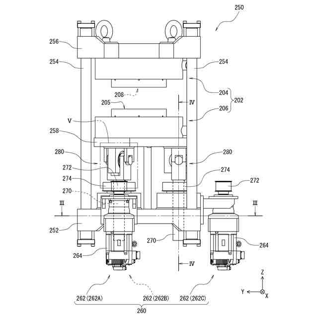 【解決手段】基盤252と、基盤252に立設されたタイバー254と、タイバー254に固定された固定プラテン256と、上下方向に移動する可動プラテン258と、可動プラテン256を駆動する駆動部260と、を備え、駆動部260は、複数の駆動機構262を個別に制御可能な構成であり、可動プラテン258は、タイバー254にガイドされない構成である。