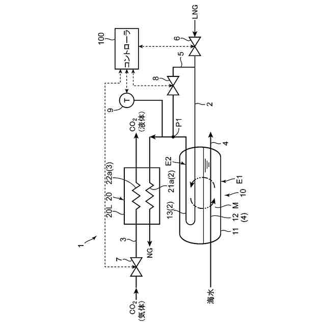 低温液化ガスの冷熱を利用して気体の二酸化炭素を液化させる熱交換システムであって、