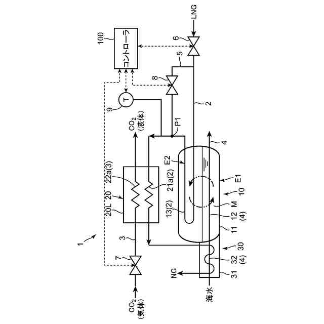 また、前記構成によれば、第1熱交換器の熱源媒体として二酸化炭素ではなく水を使用するようにしたことで、液化対象である二酸化炭素の流量が変更された場合であっても第1熱交換器における低温液化ガスの加温能力(気化能力)を十分に確保することができる。