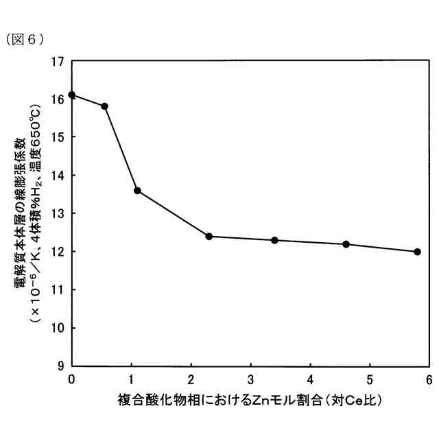 図6は、実験例1において得られた、複合酸化物相におけるZnモル割合(対Ce比)(横軸)と、電解質本体層の線膨張係数(×10