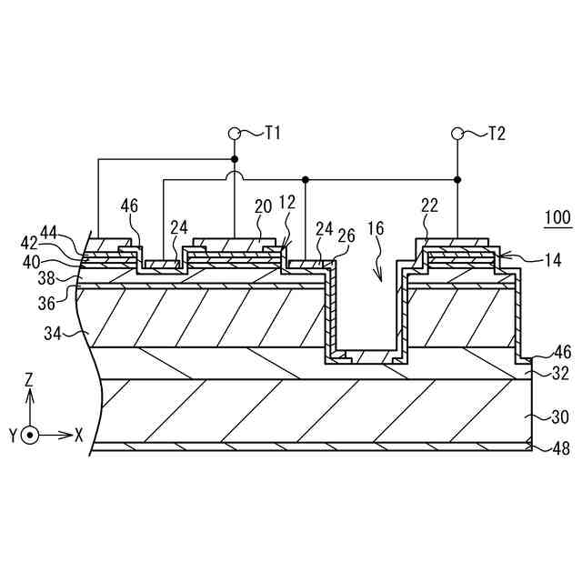 (6)上記(5)において、前記第3半導体層は、前記第2部分に第2メサを形成し、前記絶縁膜は前記第2メサを覆い、前記第1電極は前記第2メサから前記凹部の内部まで設けられてもよい。第1電極と第2電極とが同じ高さに位置する。第1電極および第2電極を外部機器に接続することができる。