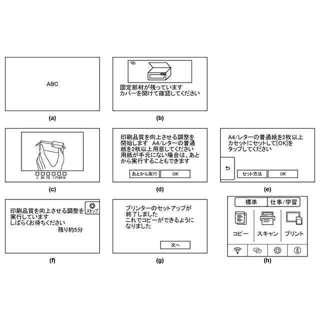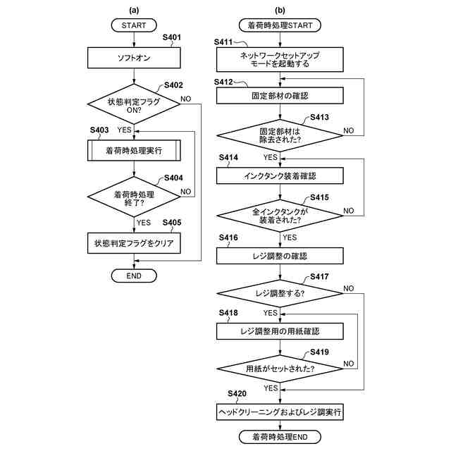 従来、ユーザが印刷装置を購入すると、初回の電源投入後の初期設置時(以下、着荷時)に、プリントヘッドのクリーニングやプリントヘッドの位置調整などの印刷準備処理、外部装置との接続設定、がシーケンシャルに行われていた。特許文献1には、印刷装置のAC電源がONされ、クリーニング処理が実行されているか否かを判定し、クリーニング処理が実行されていない場合、前回のクリーニング処理が実行されてからの経過時間によってクリーニング内容を決めることが記載されている。特許文献2には、着荷時の起動と判定された場合、記録媒体へ印刷処理を実行するための印刷準備処理を実行する実行手段と、印刷準備処理と並行して外部装置と接続するために必要な接続パラメータを設定する設定手段を備えることが記載されている。