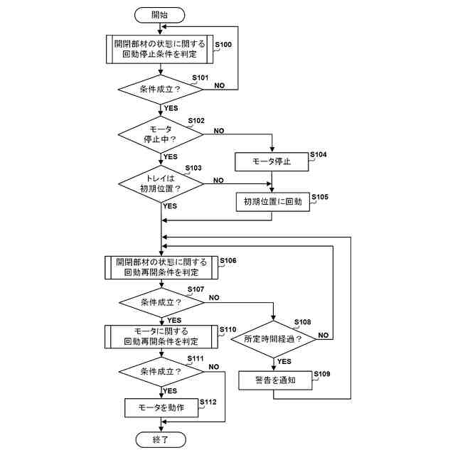 前記開閉部材の状態に関する停止条件が成立した場合に、前記トレイが水平姿勢となるように前記収容手段の回動が停止される、