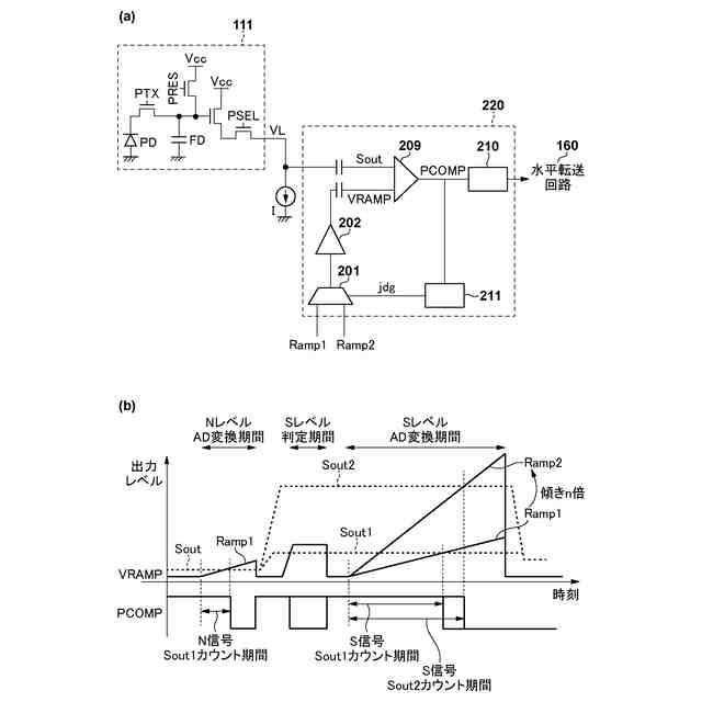 高フレームレート化のために、画素列ごとに複数のADCを設け、複数の行の画素から出力される信号を同時に信号処理することが考えられる。画素列ごとに複数のADCを設けた場合に、高密度に配されたADCの間で、ADCに信号を入力するための配線パターン間において、意図しないカップリング容量が生じる可能性がある。近接するADCに互いに傾きが異なるランプ信号を供給した場合に、傾きが異なるランプ信号同士がカップリング容量を介して互いに影響を及ぼしてしまうと、ランプ信号の傾きが変化し、AD変換ゲインが変化してしまう。結果として、得られる画像の画質が低下してしまう可能性がある。