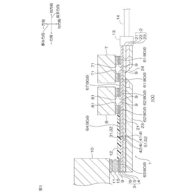 前記導体層は、さらに、前記第1貫通孔に充填される第1ビアと、前記第2貫通孔に充填される第2ビアと、中間導体部とを備え、