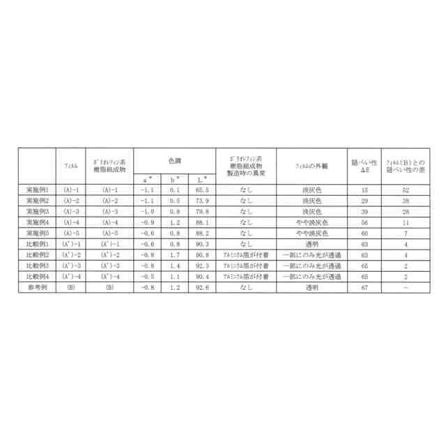 (1)温度230℃、圧力5MPaのプレス条件でポリオレフィン系樹脂組成物(A)を成形することによって得られる厚み110μmのフィルム(A)について、フィルム(A)の背景色を白色とした際のCIE1976L