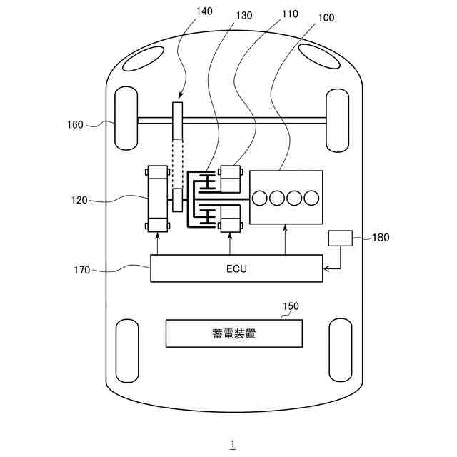 内燃機関100、第1電動機110、および第2電動機120は、動力分割装置130に連結される。ハイブリッド車両1は、内燃機関100および第2電動機120の少なくとも一方からの駆動力によって走行する。内燃機関100が発生する駆動力は、動力分割装置130によって2経路に分割される。一方は減速機140を介して駆動輪160へ伝達される経路であり、もう一方は第1電動機110へ伝達される経路である。ハイブリッド車両1の走行中、動力分割装置130は変速機として機能する。