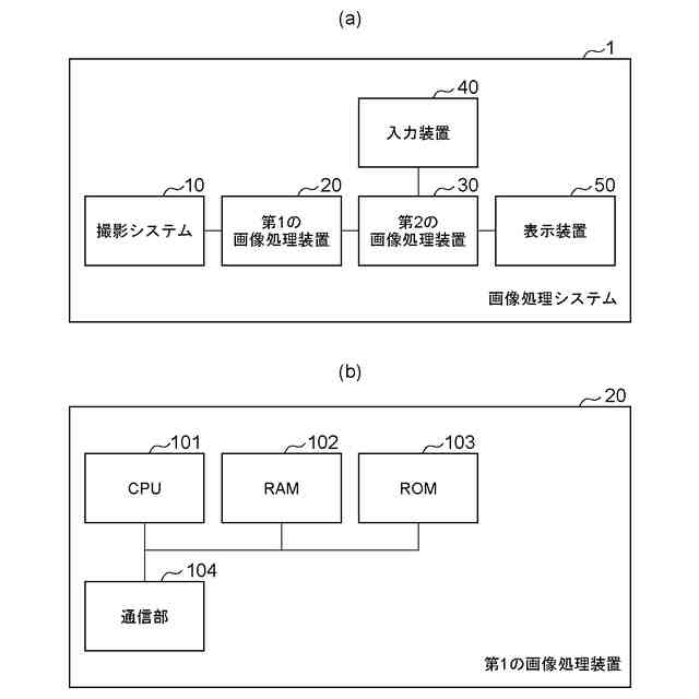 (a)は画像処理システム1の構成例を示すブロック図、(b)は画像処理装置のハードウェア構成例を示す図である。
