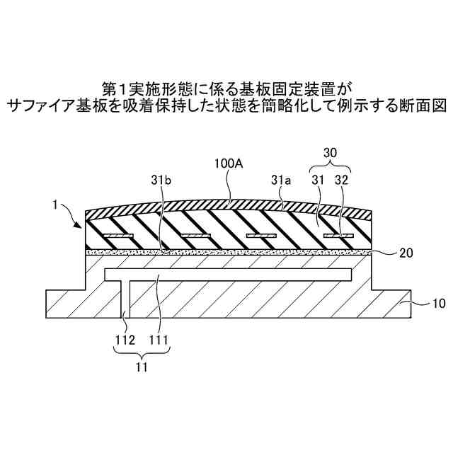 第1実施形態に係る基板固定装置がサファイア基板を吸着保持した状態を簡略化して例示する断面図である。