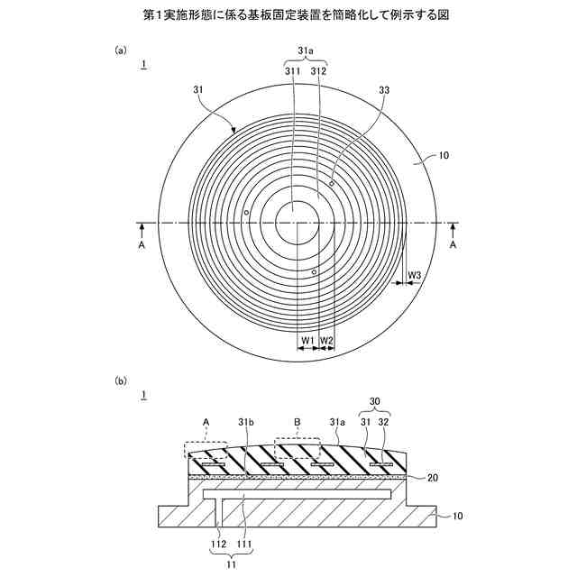 図1は、第1実施形態に係る基板固定装置を簡略化して例示する図であり、図1(a)は平面図、図1(b)は図1(a)のA-A線に沿う断面図である。
