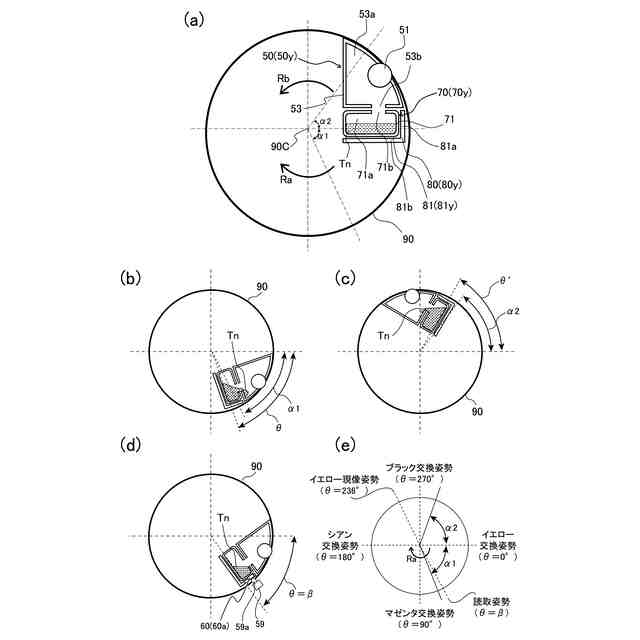 実施例1に係るロータリ本体とトナーカートリッジの1つを示す概略図(a)と、ロータリ本体の回転角度についての説明図(b)~(e)。