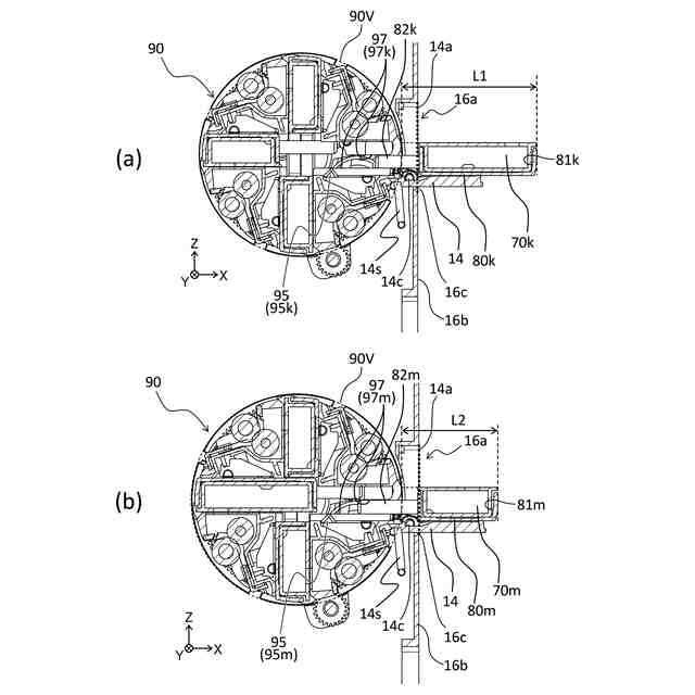 実施例1に係るトレイの移動に関する構成の説明図(a、b)。