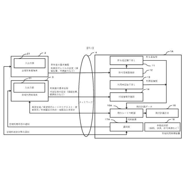 【解決手段】ネットワーク4を介して、空域利用管理装置1A、1台以上の空域所有者端末2、1台以上の空域利用者端末3、決済システム5、保険会社システム6、公的機関システム7などの間で空域利用のマッチングを行う空域利用管理システムにおいて、空域所有者は、自身が所有する土地の空域を所有している場合に空域利用管理装置1Aに所定の項目に対して希望する条件を設定し、その空域利用管理装置1Aを通じて空域利用者にドローンの空域利用を許可し、空域利用者は、空域利用管理装置1Aに所定の項目に対してドローン飛行に必要な情報を設定し、その空域利用管理装置1Aを通じて空域利用者から間接的にドローンの空域利用の許可を取得する。