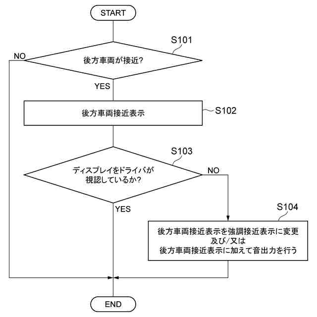 前記ディスプレイによる後方車両接近表示中に、前記第二判定ステップにより前記ドライバが前記ディスプレイを視認していると判定された場合、前記ディスプレイによる前記後方車両接近表示を継続し、