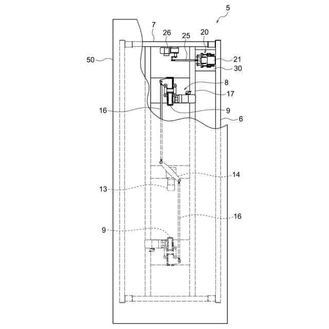 前記揺動体は、側面視、上部が狭く下部が広い三角状の部材とされ、前記上部が揺動軸により支持され、前記下部の前記原動機に近い側に前記第1平行リンク機構が接続され、前記下部の前記給電体に近い側に前記支持部材が設けられる、請求項1に記載の機械式駐車装置。