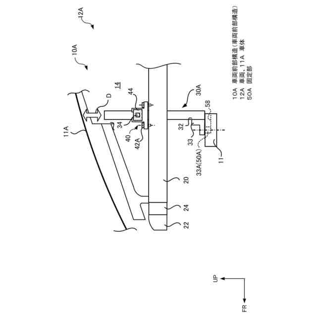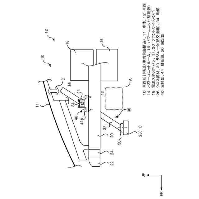 近年、ラジエータ全体への風あての観点から、ラジエータを斜めに搭載することが考えられている。前方衝突時にはフロントサイドメンバを軸圧縮させることにより衝撃を吸収しているが、ラジエータを斜めに搭載するとラジエータ下端が前方に突出するため、衝撃吸収の途中で衝突物がラジエータに接触して破損してしまう可能性がある。そのため、ラジエータの搭載構造において改善の余地がある。