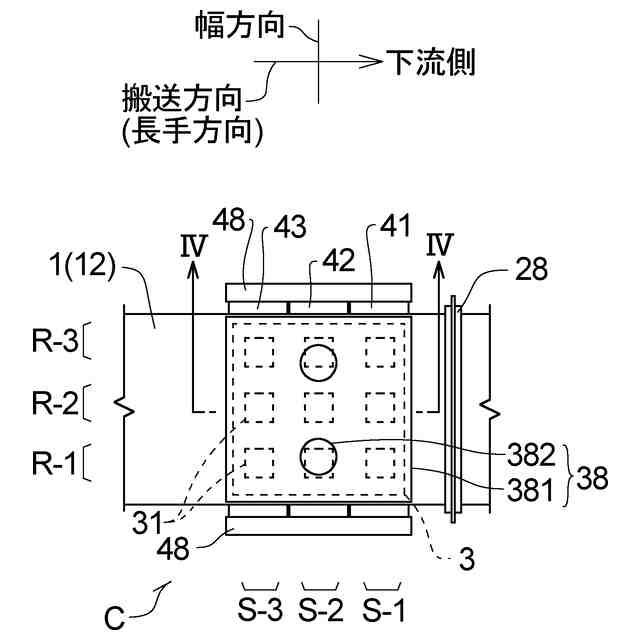 第6形態のホログラムの製造装置は、上記第1乃至第5形態のいずれかの製造装置において、前記マスター層が、複数のマスターホログラムを有し、前記マスターホログラムが、幅方向に複数列、前記幅方向と直交する方向である搬送方向に複数行で並べられており、前記感光層が長尺帯状であり、前記搬送部が、前記長尺帯状の感光層を長手方向に所定長さ分搬送して前記感光層の搬送を停止し、前記光源が、位置変更機構部を有し、前記位置変更機構部が、1つの行又は1つの列に延在する複数のマスターホログラムに前記異なる方向に進行する少なくとも2つのコヒーレントな光を照射する第1位置と、もう1つの行又はもう1つの列に延在する複数のマスターホログラムに前記異なる方向に進行する少なくとも2つのコヒーレントな光を照射する第2位置と、に照射位置を変更可能である。
