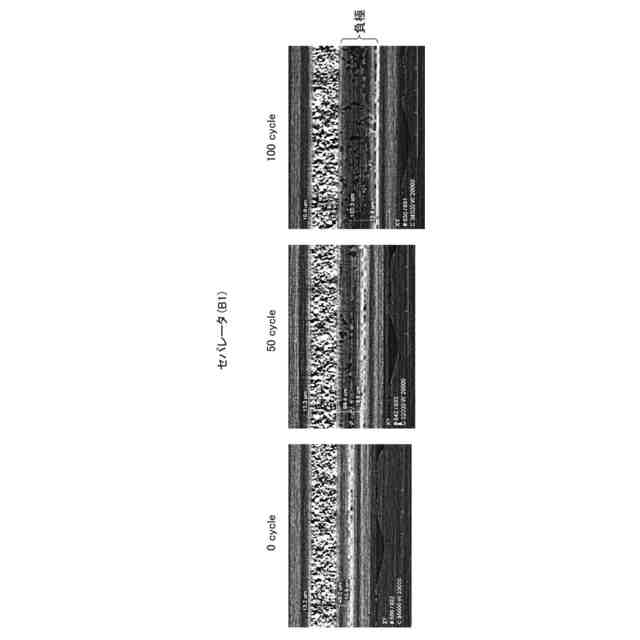 図5は、実施例1、比較例1、及び参考例1において、100サイクルでのサイクル試験における負極の厚さを示すグラフである。の2電極式セルの充放電曲線である。