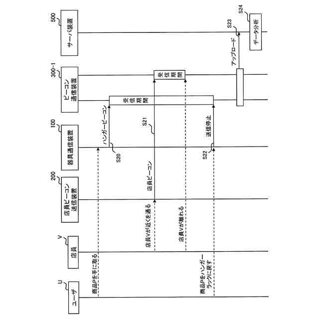 第2の態様に係るサーバ装置は、商品を保持する保持用器具及び前商品のいずれかに取り付けられた器具通信装置から送信された第1ビーコンをビーコン通信装置が受信したときの受信期間を表す第1受信期間と、店員が携帯する携帯用の店員ビーコン送信装置から送信された第2ビーコンをビーコン通信装置が受信したときの受信期間を表す第2受信期間とを、ビーコン通信装置から受信する通信部を有する。また、前記サーバ装置は、第1受信期間と第2受信期間とに基づいて、店員及び/又はユーザの行動を検出する制御部と、を有する。