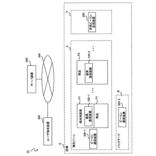 前記サーバ装置は、前記第1ビーコン通信装置が前記第1ビーコン及び前記第2ビーコンを受信した受信期間が第1時間帯に含まれ、前記第2ビーコン通信装置が前記第1ビーコン及び前記第2ビーコンを受信した受信期間が第2時間帯に含まれ、かつ、前記第3受信期間が第3閾値未満のとき、前記店員が前記商品の配置換えを行っていることを検出する