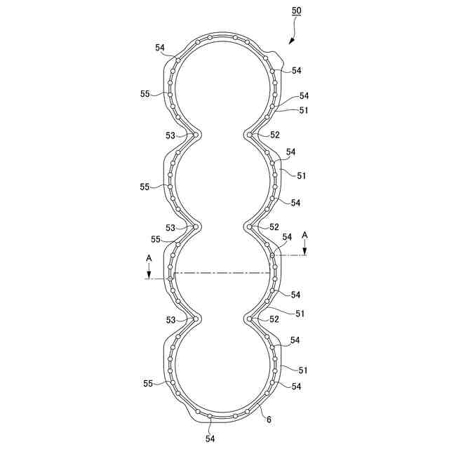 本発明は、上記目的を達成するために案出されたものである。詳述するならば、本発明のシリンダブロック補強プレートは、ピストンを摺動可能に嵌入するシリンダ壁と、前記シリンダ壁から離隔したブロック壁と、前記シリンダ壁と前記ブロック壁との間に冷却水路が形成され、前記冷却水路の上面部に開口部が形成されたオープンデッキ型シリンダブロックにおいて、前記シリンダ壁を前記オープンデッキ型シリンダブロックの上面部分であるデッキ部近傍で補強するためのシリンダブロック補強プレートであって、前記シリンダブロック補強プレートは、前記開口部を略覆い尽くす所要形状のリング部を互いに連結して一体形成した板材から成り、前記シリンダブロック補強プレートには周方向の所要個所に前記シリンダブロック補強プレートの上面から下面にかけて貫通し、冷却水路として機能すると共に冷却水に混入する気体を排出する空気抜きとして機能する複数の貫通孔と、前記シリンダブロック補強プレートの上面に刻設され、全ての前記貫通孔の上部開口部を接続する凹形状の条溝とを有する構成が含まれる。