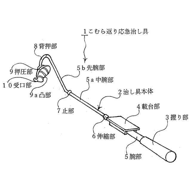 また、上体を起こせる使用者は、こむら返り応急治し具(1)を短く(前記中腕部5aを前記腕部5内に収納して前記伸縮部6で固定する)して、使用者(S)は座った状態で前記と同じ手順と作業で発症したこむら返りを速やかに容易で楽に治せる。