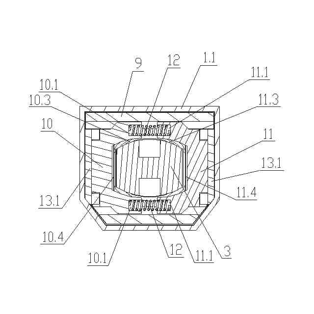前記伸縮調整モジュールは、突っ張り棒(3)と、突っ張り用ブロック(4)と、第1バネ(5)とを備え、前記締付モジュールは前記スクリューロッド(7)と、第1スライダ(8)と、第2スライダ(9)と、締め付け組立体とを備え、前記突っ張り棒(3)は外方から内方に向かって順に、前記突っ張り用ブロック(4)、前記第1バネ(5)、前記エンドカバー(1.2)、前記制限部材(13)、前記第2スライダ(9)、前記第1スライダ(8)を通過し、前記スクリューロッド(7)は前記電動駆動モジュール(2)の動力出力端に動力伝達可能に連結され、前記第1スライダ(8)は前記スクリューロッド(7)に螺合され、前記締め付け組立体は前記第2スライダ(9)内に取り付けられ前記突っ張り棒(3)を保持又は離脱するために用いられ、前記ストッパ部(3.1)は前記突っ張り棒(3)に一体成形され、自然な状態において、前記第1バネ(5)は両端に向けて押し付け、前記第1バネ(5)の一端は前記突っ張り用ブロック(4)の内端面に当接し、他端は前記エンドカバー(1.2)の内端面に当接し、前記ストッパ部(3.1)は前記制限部材(13)に当接することを特徴とする、請求項2に記載のカーテンの穴あけ不要の電動取付装置。