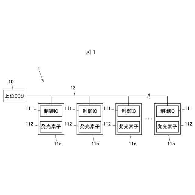 を複数のランプユニット11にバスケーブル12を介して送信する上位ECU10と、を備え、複数のランプユニット11の各々は、発光素子112と、演出指示信号S