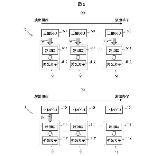 [1]LIN通信又はCAN通信を行う車内照明システムであって、1本又は2本のバスケーブルで接続された複数のランプユニットと、前記複数のランプユニットの発光動作による演出の内容を指示する演出指示信号を前記複数のランプユニットに前記バスケーブルを介して送信する上位ECUと、を備え、前記複数のランプユニットの各々は、発光素子と、前記演出指示信号の内容に応じて前記発光素子の出力を制御する制御ICとを備え、前記演出指示信号は、1つの演出の指示において、演出時間に依らずに前記複数のランプユニットに1回ずつ送信される、車内照明システム。