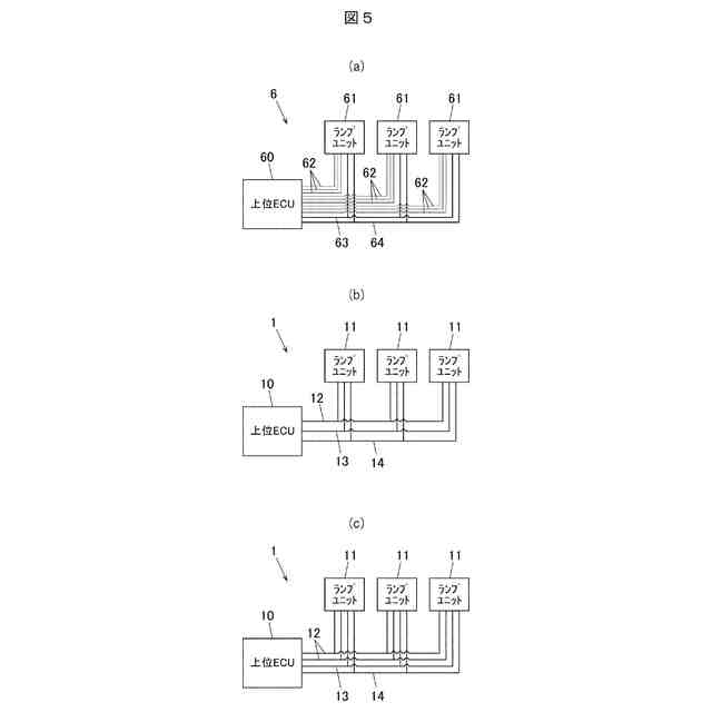 図5(a)~(c)は、比較例としての従来の照明ユニットと本発明の実施の形態に係る車内照明システムの配線数を比較するための模式図である。