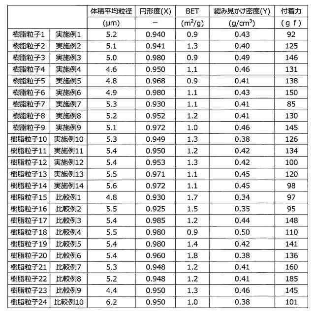 )とし,円形度をXとしたときに、前記X及び前記Yが、下記(1)~(3)の関係式を満たし、前記樹脂粒子の付着力が150gf以下であることを特徴とする樹脂粒子。