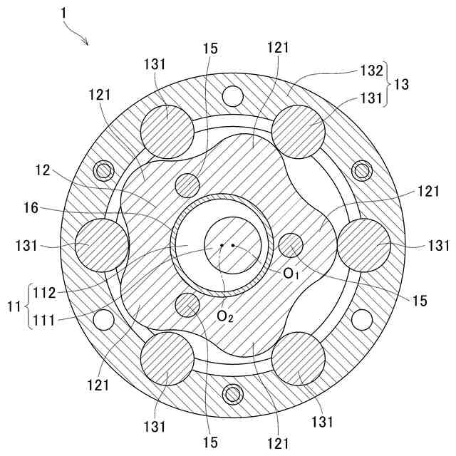 を中心として入力軸11に対して相対回転可能に配置され、外周にエピトロコイド平行曲線をした5つの歯121を有する外歯歯車12と、外歯歯車12に係るエピトロコイド平行曲線に対応する樹脂製の6個の外ローラ131が、回転自在に支持された内歯歯車13と、駆動回転軸心O