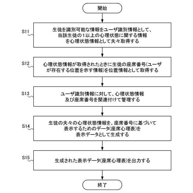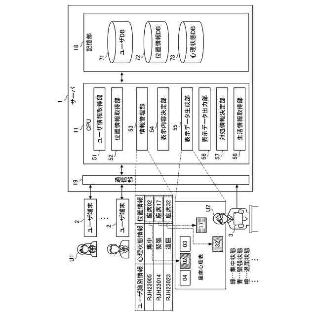 【解決手段】実施形態のサーバ1は、ユーザ情報取得部51、位置情報取得部52、情報管理部53、表示データ生成部55及び表示データ出力部56を備える。ユーザ情報取得部51は、ユーザを特定するユーザ識別情報及び当該ユーザの心理状態情報を取得する。位置情報取得部52は、ユーザの位置情報を取得する。情報管理部53は、ユーザ識別情報に、心理状態情報及び位置情報を関連付けて管理する。表示データ生成部55は、心理状態情報を、位置情報に基づいて表示する表示データ(例えば座席心理表)を生成する。表示データ出力部56は、表示データを出力する。これにより、ユーザの心理状態を位置情報に基づいて可視化でき、ユーザ毎に適切な対処方法をリアルタイムに講じることが可能になる。