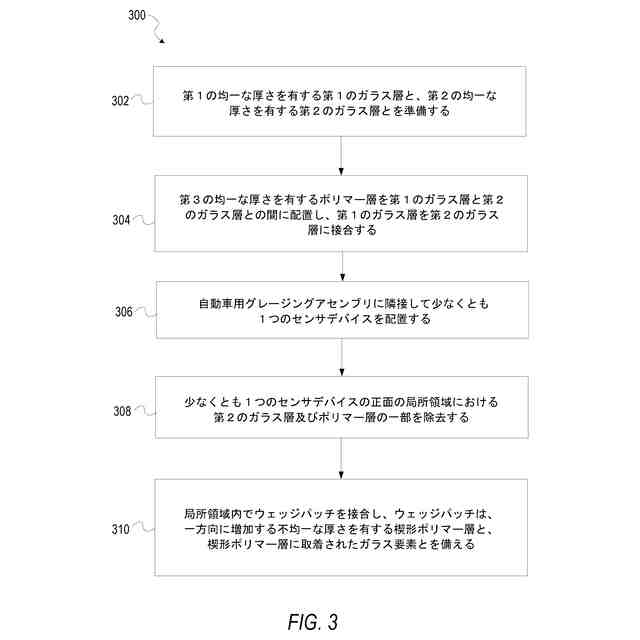 【解決手段】自動車用グレージングアセンブリは、均一な厚さを有する外側ガラス層と、同じく均一な厚さを有する内側ガラス層と、2つのガラス層の間に配置され、それらを互いに接合するポリマー層とを含む。このアセンブリの特有の特徴は、内側ガラス層及びポリマー層が除去されてウェッジパッチと置き換えられる局所領域である。このパッチは、一方向に増加する不均一な厚さを有する楔形ポリマー層と、それに取着された平坦なガラス要素とからなる。ウェッジパッチは、全内部反射及び二重画像を低減するように特に設計され、それによってフロントウィンドウの背後に配置されたカメラの光学的明瞭さを向上させる。この技術革新は、自動車用グレージングの構造的完全性及び設計を損なうことなく、明瞭なセンサ視認性の必要性に対処する。