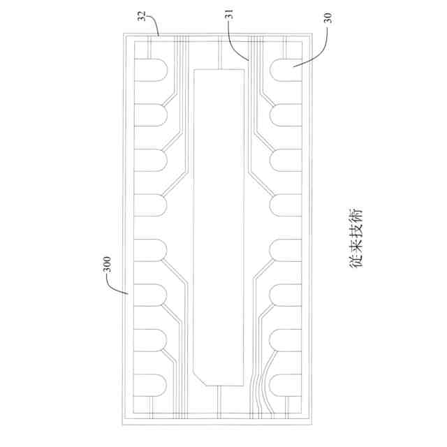 リードフレーム300をまず全面的に切断するのも通常の方法である。切断された側面の剥き出しの金属がはんだ材料で覆われるようにするために、通常、リードフレーム300を切断した後に電気めっき工程が行われ、それによって露出した金属がはんだ材料で覆われる。このように、露出した金属パッドが直列回路にあることを確保する必要がある。例えば、図3(米国特許第9640463号明細書)の従来のリード接続を示す模式図によって示されるように、各リード30は、16本のリード30を直列に接続するための金属接続バー31に接続され、その周囲の金属フレーム32に接続されることにより、電気メッキ工程を行うことができる。しかしながら、このような態様では、接続バー31の本数がリード30の本数に依存するため、設計上の制約が厳しく、製造工程が複雑であり、品質の信頼性が低い。