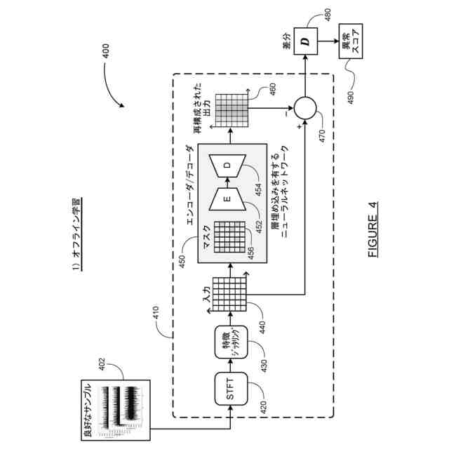 図4は、本開示の一実施形態における、オフライン学習用に構成された異常検出システムのブロック図であり、エンコーダ/デコーダニューラルネットワークを有する再構成に基づく異常検出モジュールが良好な時系列データサンプルで訓練される。