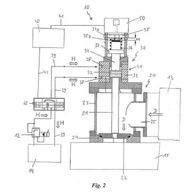 さらに、ピストン位置の関数として制御機構によって制御可能である比例弁機構が、流体伝導式に油圧シリンダに接続されていることが、本発明の関連において不可欠であると認識されている。比例弁機構は、対応する圧縮流体源に供給され、作動油とも呼ぶことができる圧縮流体の供給及び排出が、油圧シリンダに供給され、油圧シリンダから排出され得るように、流体伝導式に油圧シリンダに接続される。この目的のために、油圧シリンダと圧縮流体源との間に油圧配管を配置することが可能であり、比例弁機構は油圧シリンダと圧縮流体源との間に配置される。