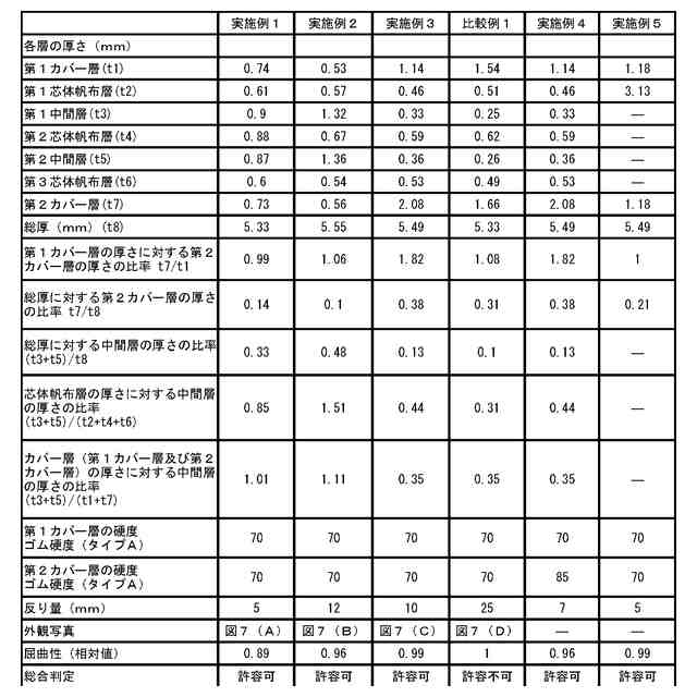 前記第1カバー層と前記第2カバー層との間に積層され、帆布素材を含む、少なくとも2層の芯体帆布層と、