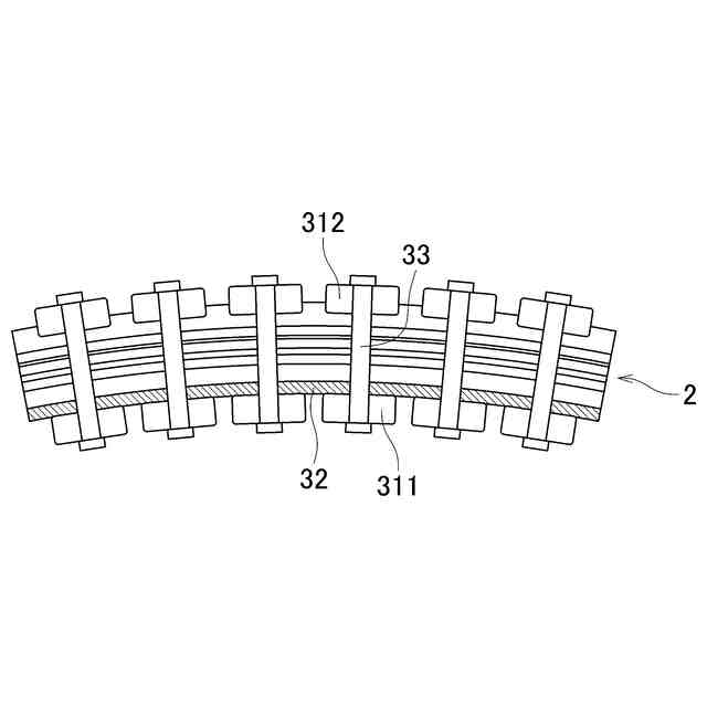 特許文献2では、開口部を押圧することでU字状となるフックを複数並列させ、フックの一方の端部付近を、Fig1における部材23のワイヤーで結合した連結金具が開示されている。また、特許文献3の図1には、端部につめを有する長いブランチが連続バーの一方の側から突出し、連続バーの他方の側からは端部につめを有する短いブランチが突出した連結金具が開示されている。このように、コンベヤベルトの両端部を連結する連結金具は、コンベヤベルトの裏面側または表面側に当接する部分で結合されている一方、コンベヤベルトの表面側または裏面側に当接する部分は結合されずにフックが所定の間隔で離間して並列する構造となっている。