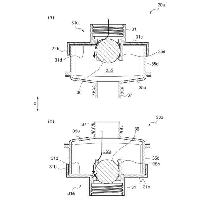 図7(a)は、上下反転前の図6に示すバッファー部の液体の流れを説明するための縦断面図であり、図7(b)は、上下反転後の同縦断面図である。