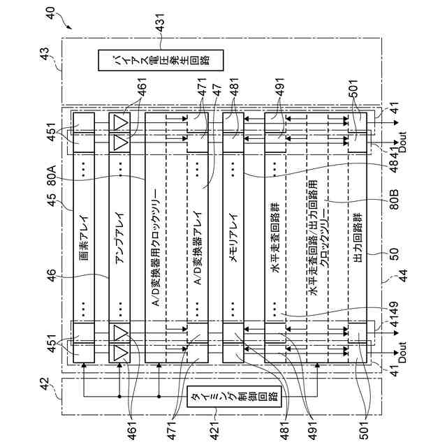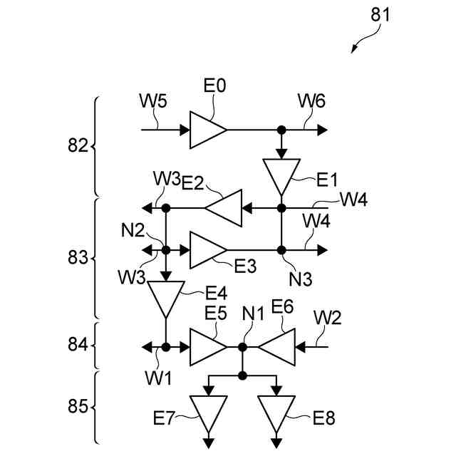 【解決手段】クロック伝達回路80は、互いに共通の回路パターンを有し方向D1に沿って並ぶ複数の回路領域81を備える。複数の回路領域81それぞれの回路パターンは、高インピーダンス状態および通過状態を切り替え可能な回路要素E0~E6と、隣接する回路領域81の回路パターンに接続される配線と、を有する。複数の回路領域81の回路要素E0~E6の状態が、回路領域81毎に定められる所定の状態に制御されることにより、複数の回路領域81を横断するクロックツリーが構成される。