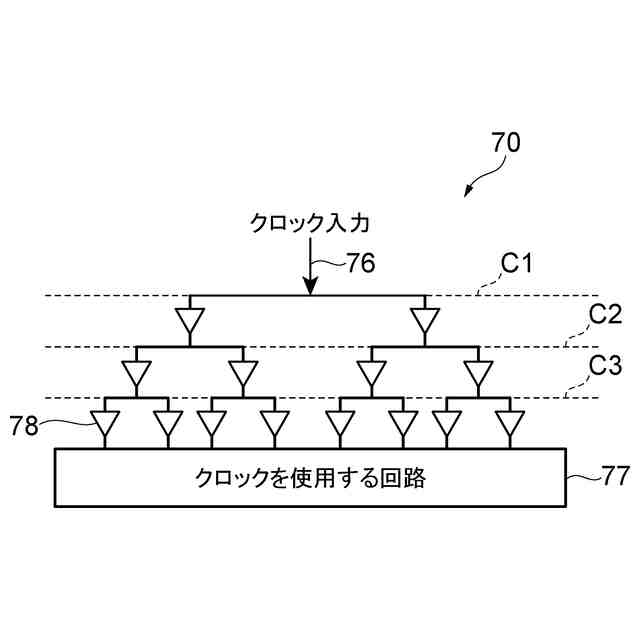 半導体素子の内部においてクロック信号を伝搬する際には、クロック配線の長さ及び負荷に応じてクロック信号に遅延が生じる。そこで、多数の回路にクロック信号を同一のタイミングで入力したい場合には、クロックツリーが用いられる。クロックツリーにおいては、クロック供給先である回路群の中心位置に関して左右対称にクロック信号の分岐を繰り返すことが望ましい。