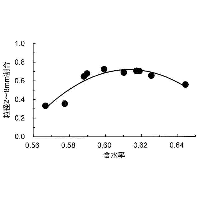 発酵鶏糞などの有機質原料の粉末を、内部で回転翼が高速回転している筒状の筺体内に上方から供給し、この筺体内で浮遊状態にして上下方向及び円周方向に回転させると共に、自転させ、筺体内に多数の水滴を散水して前記粉末を凝集させ、所要時間経過後に粉状のコーティング剤を筺体内に供給し、前記粉末が凝集した顆粒の表面をコーティング剤で覆うようにした有機肥料の造粒方法において、前記粉末を、高圧空気の供給なしに、かつ、高圧空気の供給と共に被処理粉末を流動させるための孔付円盤なしに、前記回転翼の回転力によってのみ浮遊させ、旋回させ、かつ、攪拌させるようにしたことを特徴とする醗酵鶏糞などからの有機肥料造粒方法(特許文献2)が知られている。しかし、この方法では鶏糞等一部の粉体原料に限られ含水率が50%を超える堆肥原料として用いることができないとともに、コーティングを必須とするため、手間とコストがかかる。また、リン酸、窒素、カリウム等有効成分の変化、粒形等は調べられていない。