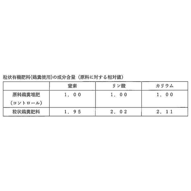 乾燥した発酵鶏糞を篩分けし、スクリュー形状を持つ押出し造粒機により造粒する工程において、少量の水を発酵鶏糞に添加して顆粒に造粒し、個々の顆粒の表面に肥効を増強する粉末をコーティングし、個々の顆粒同士を分離状態で生成させたことを特徴とする粒状有機肥料組成物(特許文献3)が知られているが、粉体の鶏糞に限定されること、コーティング加工を必要とすることの制約があり、また、リン酸、窒素、カリウム等有効成分の変化も記載されていない。